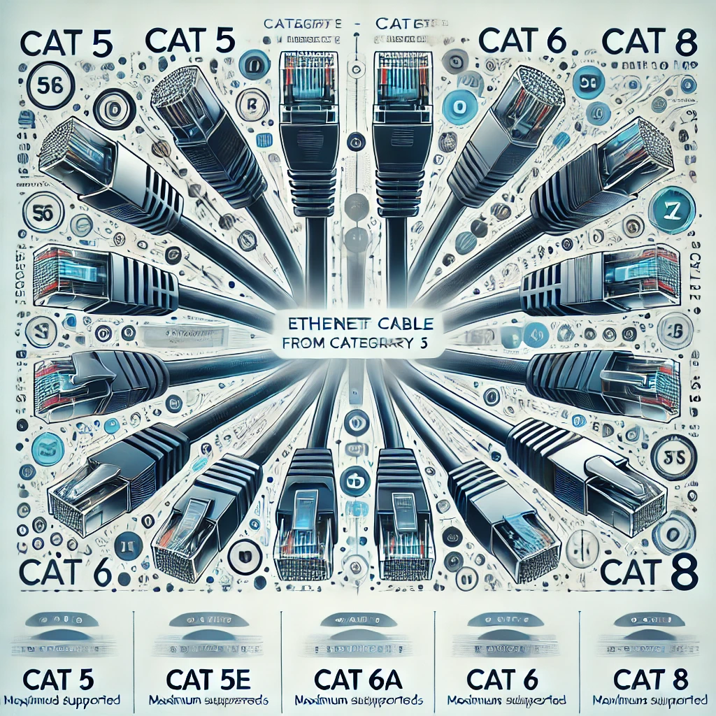 | Cat 5e | 1 Gbps, op til 2,5 Gbps | 100 meter (1 Gbps), 55 meter (2,5 Gbps) | Forbedret version af Cat 5, som kan håndtere 1 Gbps og op til 2,5 Gbps over kortere afstande. |